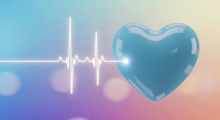 A glossy blue heart shape is connected to a glowing electrocardiogram line, set against a soft, blurred gradient background with bokeh effects.