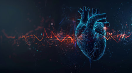 An abstract background with glowing heart waveforms running across a dark blue grid, representing heart health, technology, and life sciences.