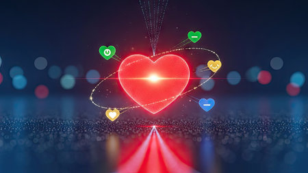 A radiant red heart illuminated by internal light is the central subject, surrounded by orbiting icons. The composition features a futuristic aesthetic with digital lines and bokeh effects against a dark backdrop. The visual style suggests concepts related to health, data, and interconnectedness suitable for various commercial applications.