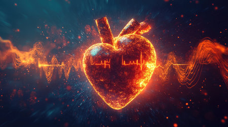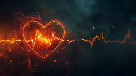 An artistic representation of a heart illuminated by fiery energy, with heartbeat lines that symbolize love and life, evoking emotions and passion in this captivating artwork.