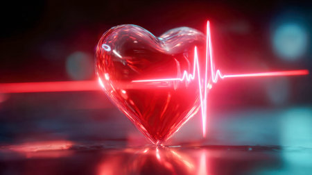 Red glowing glass heart with an ECG heartbeat line, symbolizing health, vitality, and cardiology.