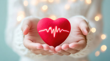 Glowing heart with heartbeat line held in open hand, symbolizing life, health, and compassion