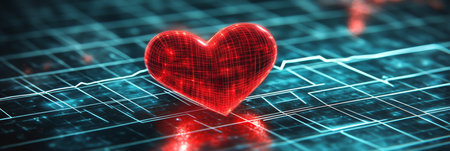 Glowing Red Digital Heart Monitoring on Grid Background with Abstract Lines, Vector Style