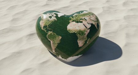 Polished heart shaped earth globe with visible continents resting on soft white sand, symbolizing global environmental protection, sustainability, and love for nature.