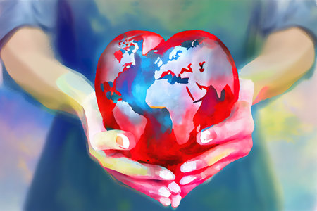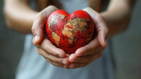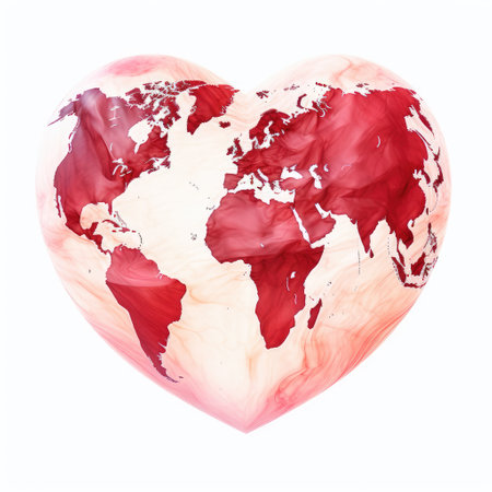 A vibrant red heart displays a world map, symbolizing global love and connection. The soft focus background enhances the theme of unity and compassion.