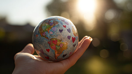 A hand cradles a globe decorated with colorful heart shapes, set against a blurred background illuminated by sunlight. The image presents a close-up perspective emphasizing textures and colors. This composition could be used for conceptual illustrations related to themes like global unity, environmental awareness, or social responsibility, suitable for diverse commercial applications.