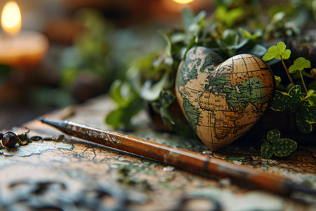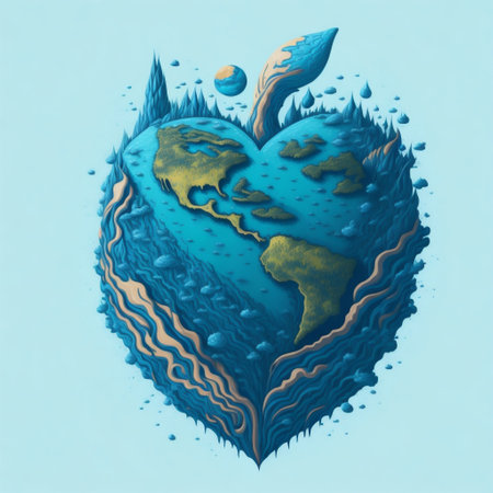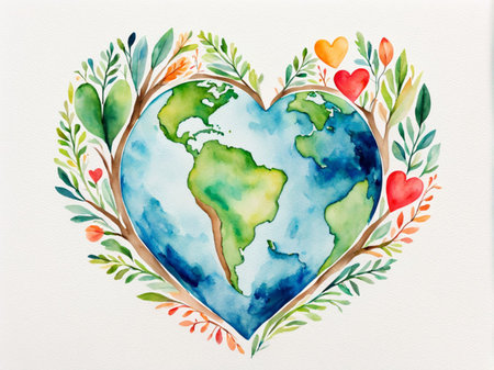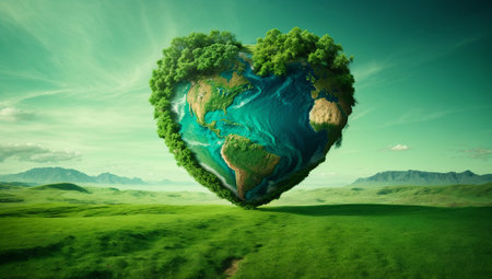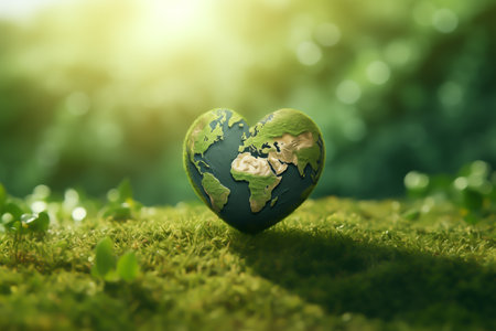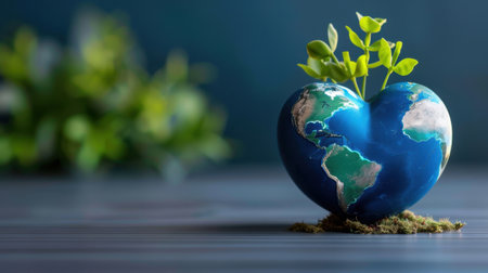 A heart-shaped globe symbolizes love for the Earth, showcasing lush green plants that represent hope, growth, and environmental awareness for a sustainable future.
