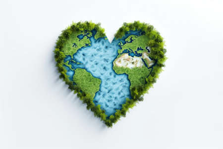 A captivating image of Earth formed by lush greenery in a heart shape, symbolizing love for the planet, surrounded by clear skies and vibrant nature.