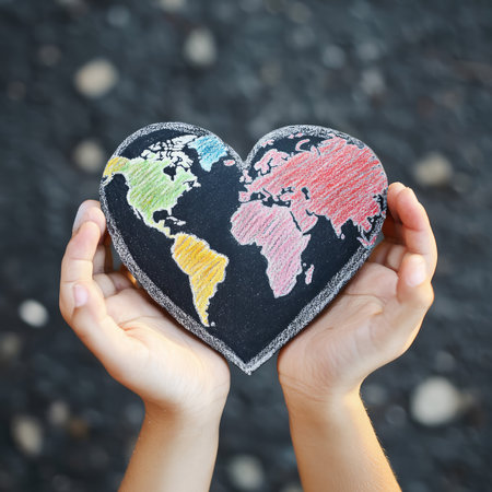 Child's hands holding a heart-shaped drawing of the world. Concept of global love and care.