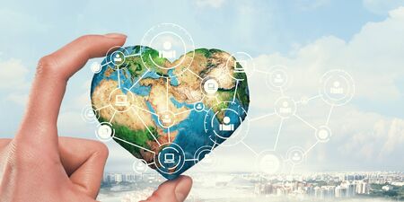 Happy Earth world humanitarian day concept illustration.Hands holding a planet. Globe shaped heart