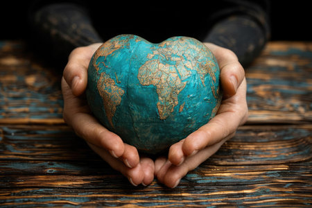 A heart-shaped representation of the world map rests on a rustic wooden surface, symbolizing global love, unity, and emotional connection among people.