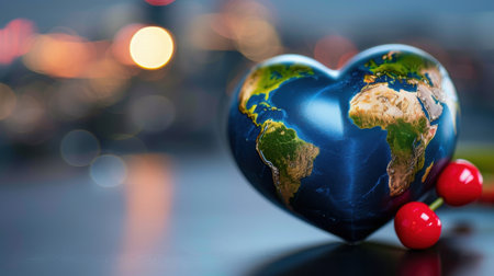 A heart-shaped globe featuring a detailed map of the Earth alongside a cherry, set against a softly blurred background. Perfect for themes of love and connection.