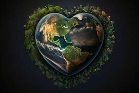An AI generated illustration of a heart shaped planet covered by fresh green leaves, ecology concept