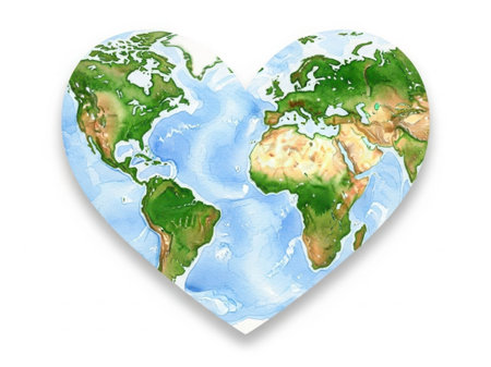 A detailed world map creatively shaped into a heart, showcasing the continents and oceans in a visually appealing manner.