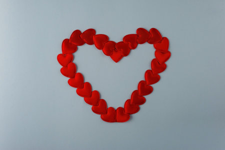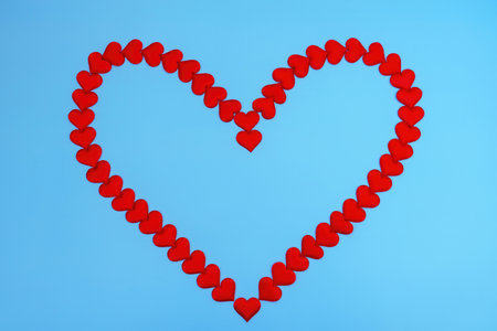 heart laid out from small red hearts on a blue background.