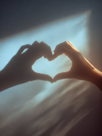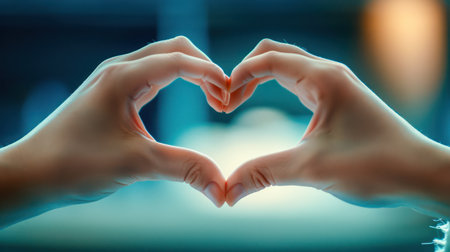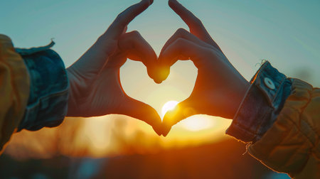 Close-up of hands forming heart shape with warm light in background.