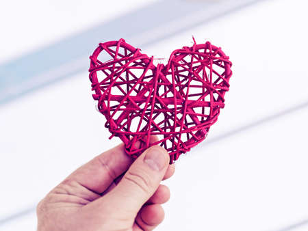 The man is holding a red wicker heart in his hand against the background of a light wall with diagonal stripes.