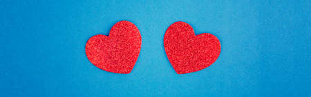 Happy Valentine Day. Beautiful card wallpaper with two red hearts in centre on blue background. Concept of love February holiday. Web banner header for website.