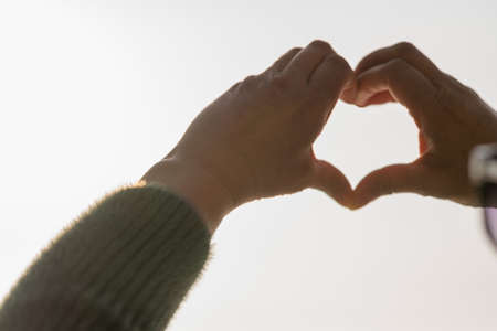 Heart symbol, Heart made by hands with blurry white sky background.Closeup.