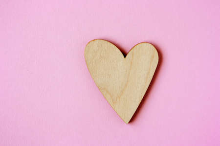 Minimal concept of wooden heart against pastel pink background. Flat lay.