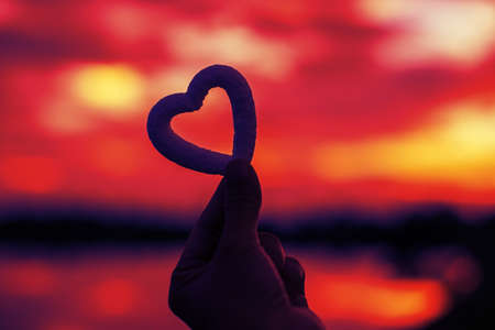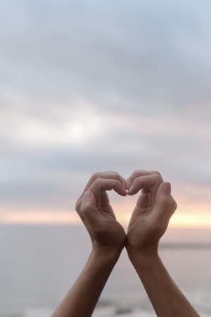 Bright sunset and hands of a man forming a heart shape silhouette on natural oudoors abstract background. Close up on emotional human feeling over sunny seascape shore leisure travel landscape