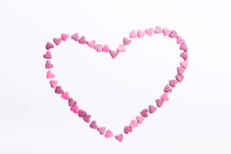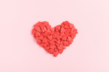 Heart shape made of small edible sweet sprinkles on pastel pink background. Top view. Valentines day.