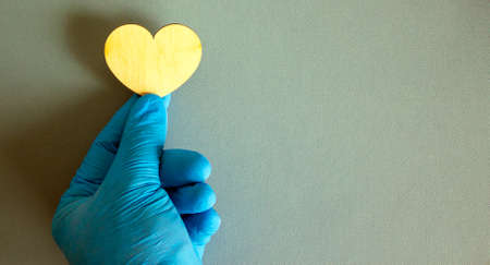 Wooden heart, hand in blue glove on blue background.