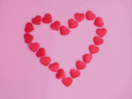 The heart shape is made of many small red hearts. Looks like candy. Place for text. Light pink background. Romantic background, Valentine's Day holiday background.