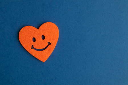 Orange smiley face with a heart-shaped smile on a blue background with a space for the test. Good mood.