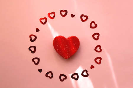 Small red heart and heart shaped confetti on pastel pink background. Flat lay.