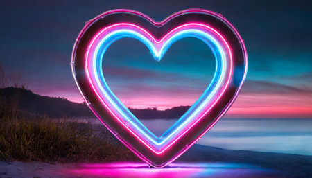 This futuristic neon heart sign features an electrifying blend of pink and blue, delivering a vibrant, glowing aesthetic perfect for modern designs, advertising, events, or creating romantic