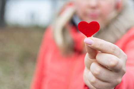 The girl holds out a heart in her hand as a sign of love.