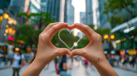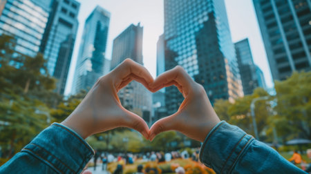 Close-up of hands shaping a heart in a bustling city park generative ai