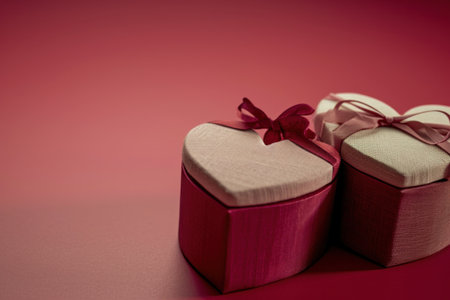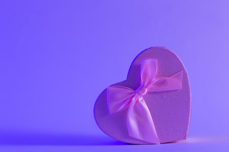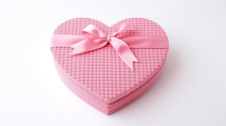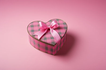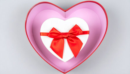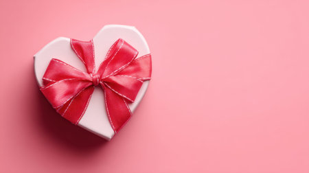 A charming heart-shaped gift box adorned with a vibrant red ribbon rests against a soft pink backdrop, ideal for gifting on romantic occasions or special celebrations.