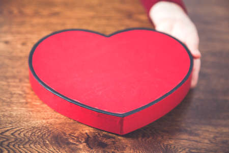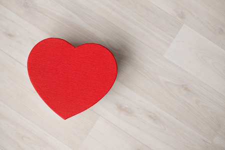 A gift box in the form of a red heart stands on a wooden floor. Valentine's Day - February 14. High quality photo