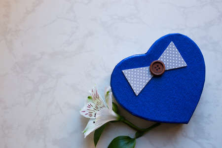 Blue gift box in shape of heart with single alstroemeria flower on marble surface. Spring composition. Springtime. Mother`s day card.