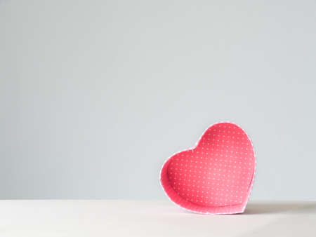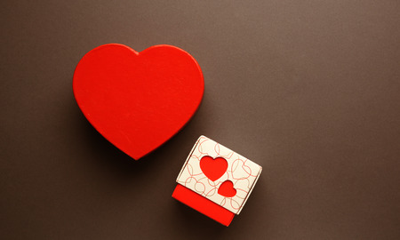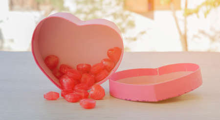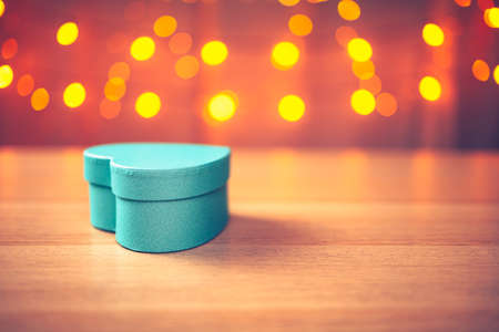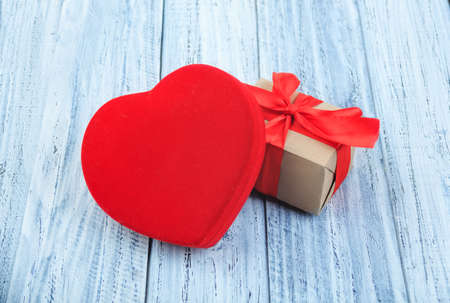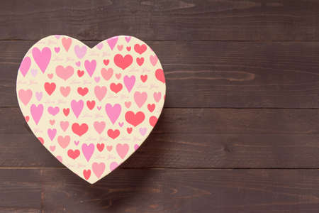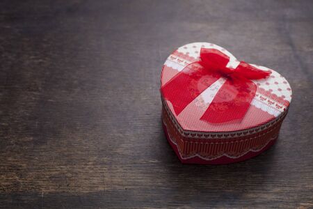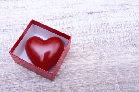 Heart box is on the wooden background with empty space.
