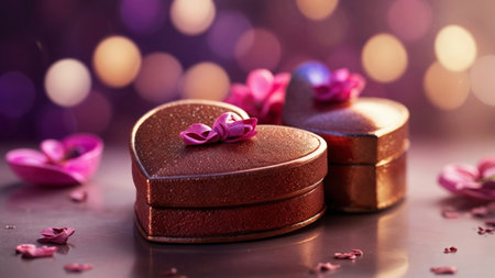 Two heart-shaped boxes, one slightly behind the other, rest on a reflective surface. The foreground heart is larger and a glittery, metallic dusty rose color.