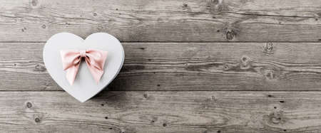 Heart-shaped box with a gift on a white wooden background.