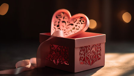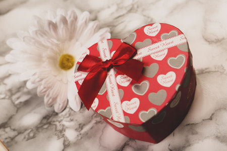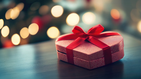 A heart-shaped gift box with a red ribbon, placed on a table with a blurred Valentine's Day background
