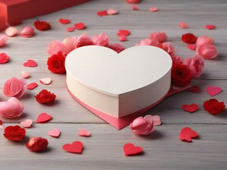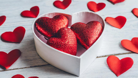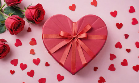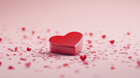 A heart shaped gift box adorned with a red ribbon rests on a white surface. Surrounding it are tiny red hearts and shimmering confetti, creating a festive atmosphere perfect for celebrations.