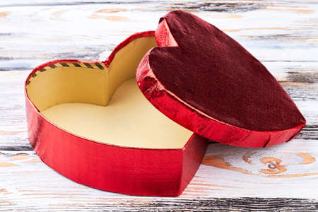 Open empty heart-shaped gift box. Elegant red gift box in a shape of heart on white wooden background. Container for Chrisrtmas decorations.