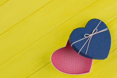 Opened empty heart shaped gift box. Red interior with white dots. Yellow wooden table surface.