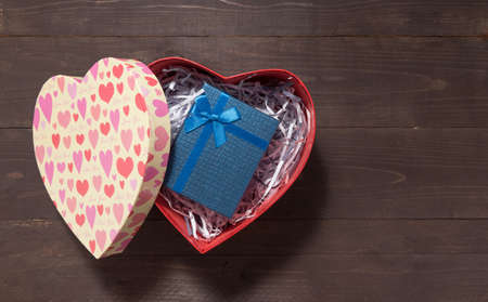 Gift box is in heart box, on the wooden background with empty space.