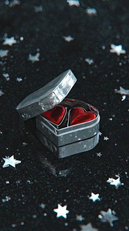 An open, heart-shaped box reveals red velvet. It is set against a dark, sparkling background with scattered star shapes. The composition is well-lit, highlighting the box's texture and detail. This image could be used for various commercial or editorial purposes, like romantic themes.