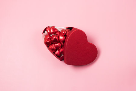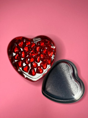 Beautiful Red Chocolate Hearts Candies in Red Box Shape of Heart on Pink Background St Valentine Day Background Dessert Copy Space