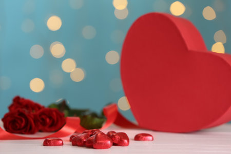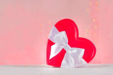 Happy Valentine's Day. Heart shaped gift box on white table against gray background with blurred lights, closeup