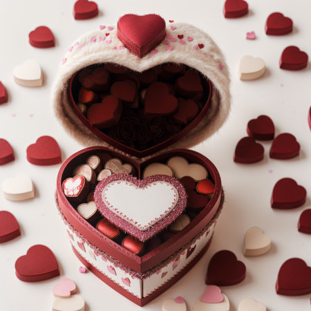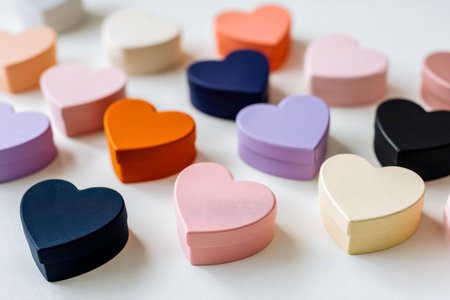 Vibrant, pastel-hued gift boxes in heart shapes are artfully arranged on a pristine white surface, evoking warmth and celebration.