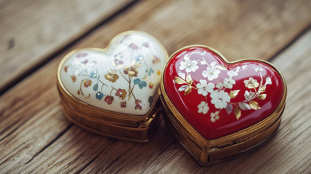 This image features two exquisite heart-shaped jewelry boxes adorned with intricate floral patterns, resting elegantly on a rustic wooden surface.