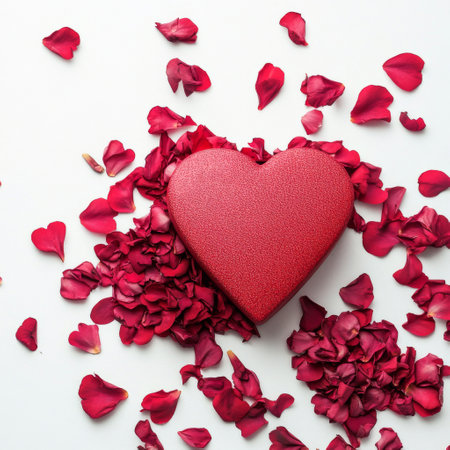 A heart-shaped box is filled with vibrant red rose petals, lying among scattered petals on a clean white surface, creating a romantic and intimate atmosphere perfect for special moments.